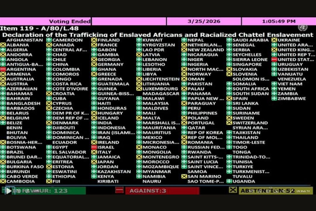 The vote took place yesterday, coinciding with the International Day of Remembrance of the Victims of Slavery and the Transatlantic Slave Trade. It builds on decades of advocacy by African and Caribbean states, drawing on earlier declarations such as the 1993 Abuja Proclamation and the 2023 Accra Proclamation.